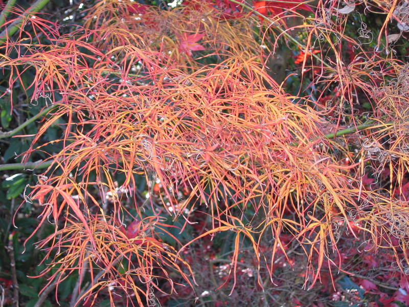 Séparées jusqu’à la base, ses grandes feuilles laciniées rouges à brun rouge, verdissent légèrement pendant l’été et s’empourprent en automne ; elles supportent bien le soleil. Relativement petit, 2 à 3m, il a une forme plus évasée que les autres ‘lineare’ ; sa forme s’arrondit avec le temps.