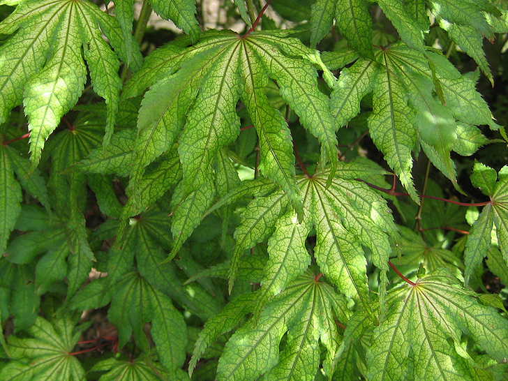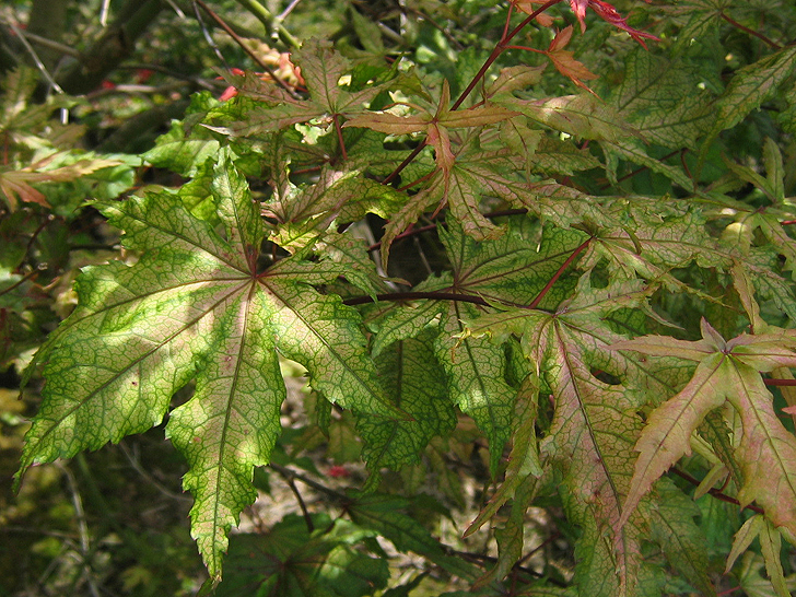 Sa forme étalée lui confère un aspect « japonisant » naturel. Rustique et relativement poussant, il peut atteindre 3 à 4m en tous sens ; un léger ombrage pendant les heures d’été les plus chaudes est souhaitable. Son feuillage marbré rose bordeaux vert tendre, nervuré de vert foncé s’estompe en été pour devenir orange rouge flamboyant en automne.