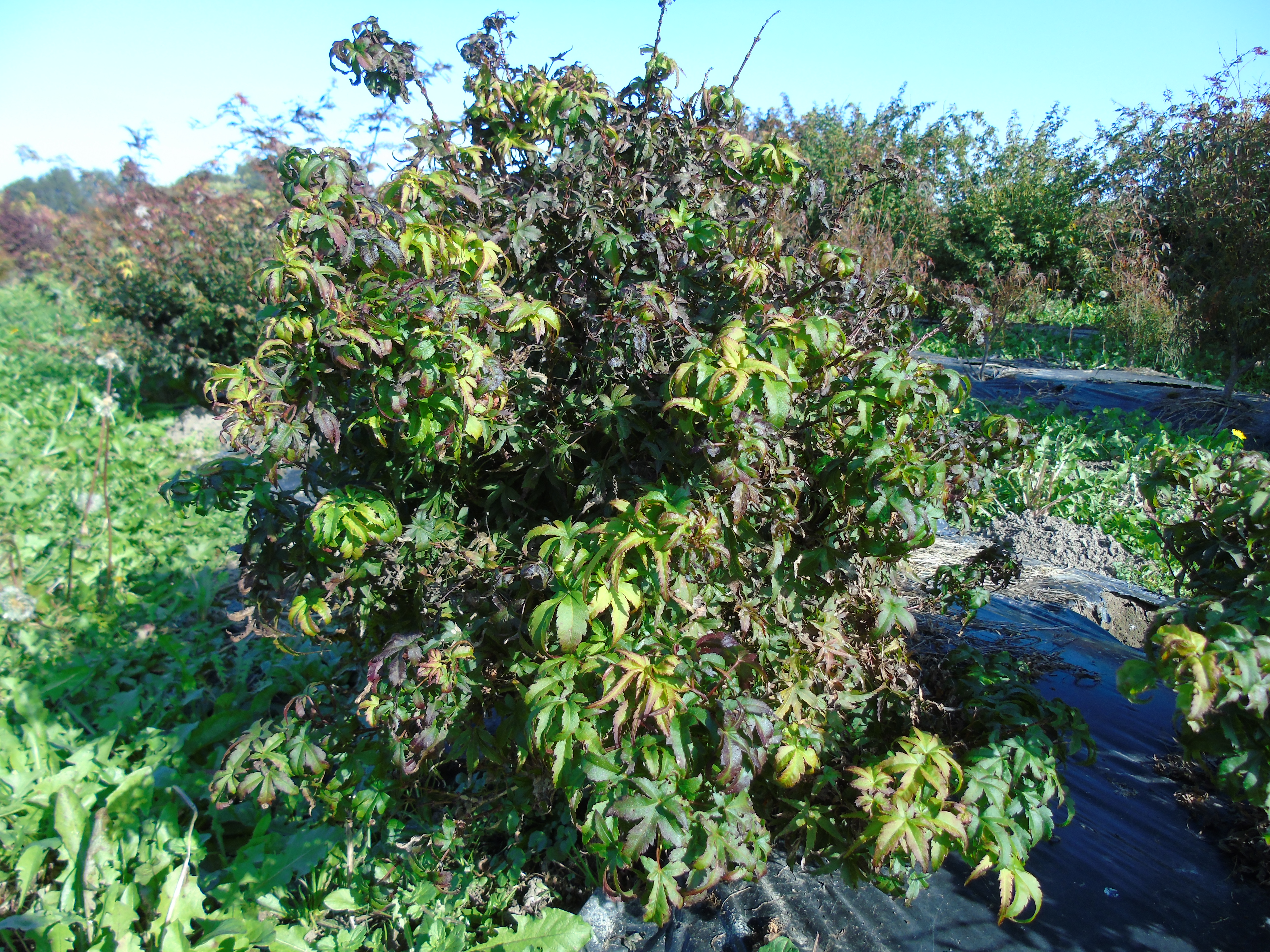Il forme un arbuste au feuillage dense, compact qui s’évase lentement et ne dépasse pas 1.5 à 2m de haut, sa tolérance au soleil est bonne. Plus longues que larges, ses feuilles aux 5 lobes dentés bien séparés prennent différents tons de vert du printemps à l’automne où l’arbre devient orange foncé écarlate.